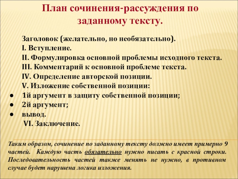 Таким образом, сочинение по заданному тексту должно имеет примерно 9 частей. Каждую часть обязательно нужно писать с красной строки. Последовательность частей также менять не нужно, в противном случае будет нарушена логика изложения.