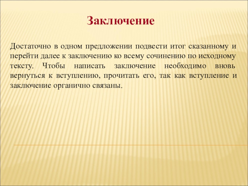 к заключению ко всему сочинению по исходному тексту. Чтобы написать заключение необходимо вновь вернуться к вступлению, прочитать его, так как вступление и заключение органично связаны.