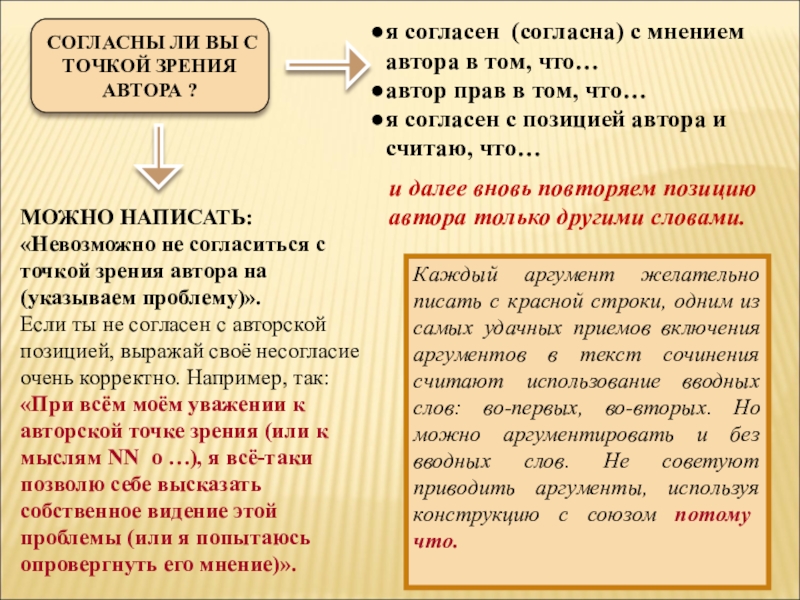 Каждый аргумент желательно писать с красной строки, одним из самых удачных приемов включения аргументов в текст сочинения считают использование вводных слов: во-первых, во-вторых. Но можно аргументировать и без вводных слов. Не советуют приводить аргументы, используя конструкцию с союзом потому что.