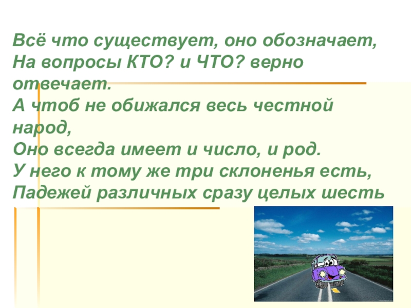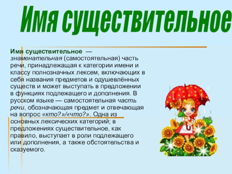 категории имени и классу полнозначных лексем, включающих в себя названия предметов и одушевлённых существ и может выступать в предложении в функциях подлежащего и дополнения. В русском языке — самостоятельная часть речи, обозначающая предмет и отвечающая на вопрос «кто?»/«что?». Одна из основных лексических категорий; в предложениях существительное, как правило, выступает в роли подлежащего или дополнения, а также обстоятельства и сказуемого.