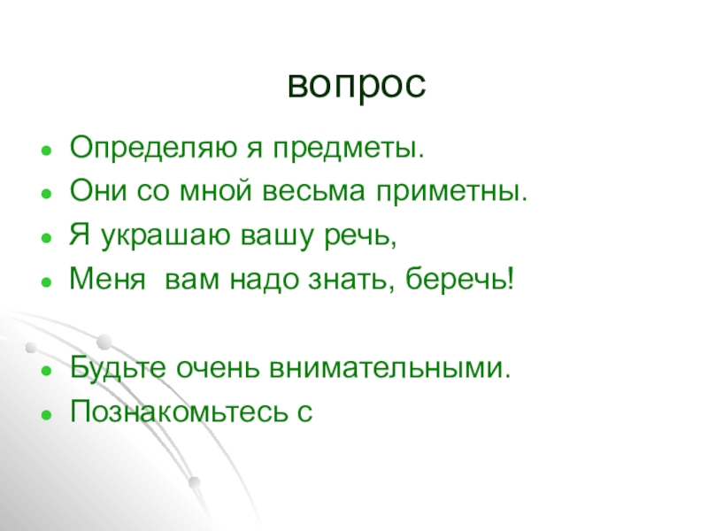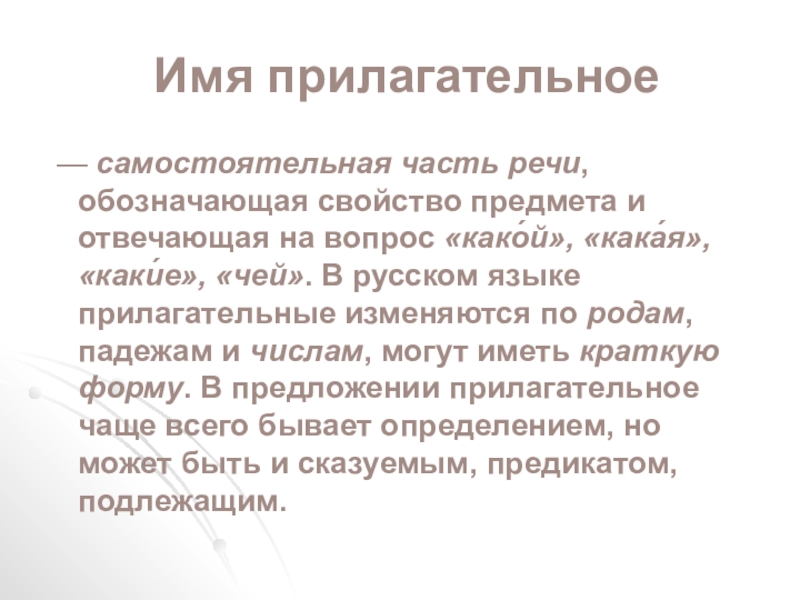 вопрос «како́й», «кака́я», «каки́е», «чей». В русском языке прилагательные изменяются по родам, падежам и числам, могут иметь краткую форму. В предложении прилагательное чаще всего бывает определением, но может быть и сказуемым, предикатом, подлежащим.