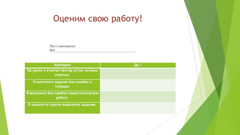 Оценим свою работу!Лист самооценкиФИ______________________________________________