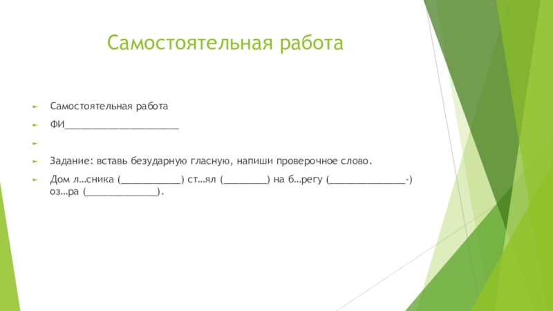 Самостоятельная работаСамостоятельная работаФИ_____________________ Задание: вставь безударную гласную, напиши проверочное слово.Дом л…сника (___________) ст…ял (________) на б…регу (______________-) оз…ра