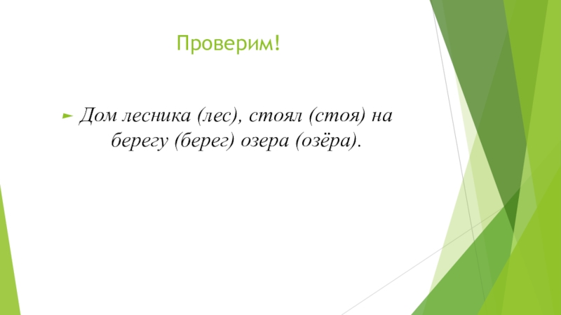 Проверим!Дом лесника (лес), стоял (стоя) на берегу (берег) озера (озёра).
