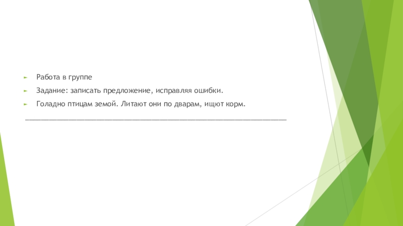 Работа в группеЗадание: записать предложение, исправляя ошибки.Голадно птицам земой. Литают они по дварам, ищют корм.__________________________________________________________________