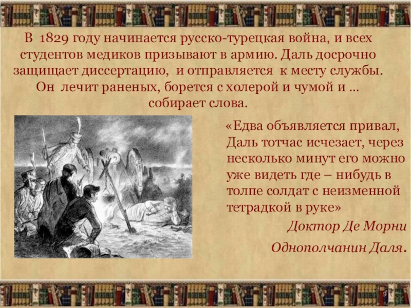 Слайд 9В 1829 году начинается русско-турецкая война, и всех студентов медиков призывают