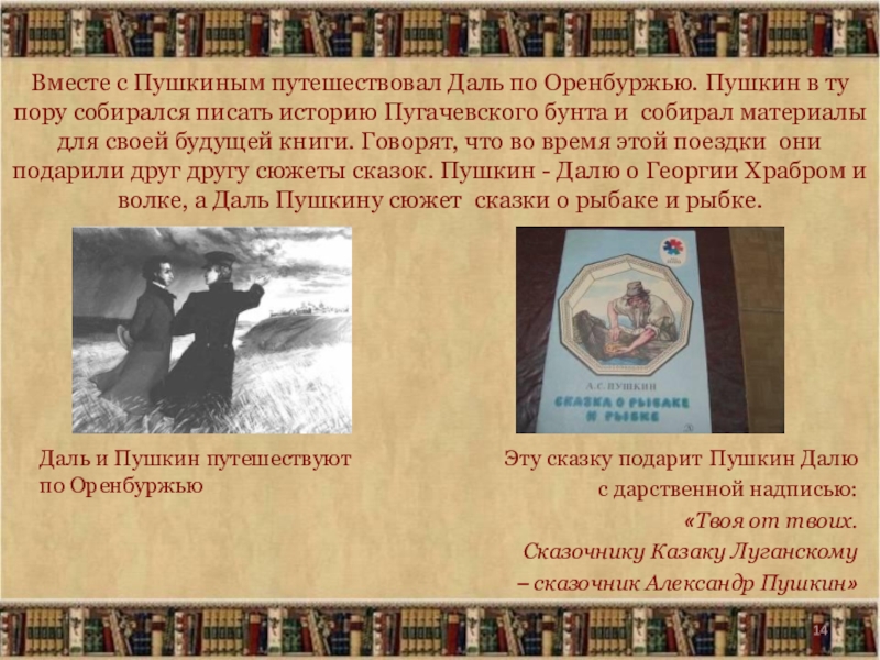 Слайд 14Вместе с Пушкиным путешествовал Даль по Оренбуржью. Пушкин в ту пору