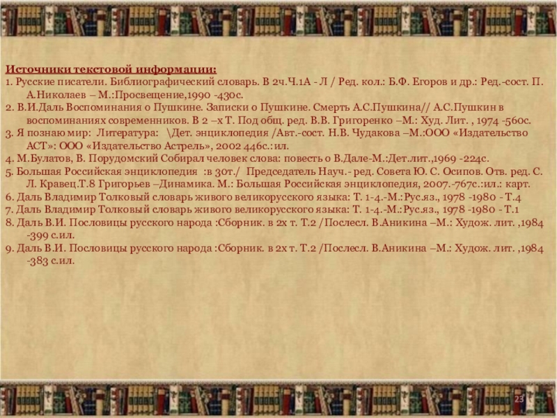 2. В.И.Даль Воспоминания о Пушкине. Записки о Пушкине. Смерть А.С.Пушкина// А.С.Пушкин в воспоминаниях современников. В 2 –х Т. Под общ. ред. В.В. Григоренко –М.: Худ. Лит. , 1974 -560с.