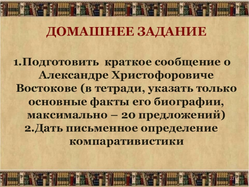 Подготовить краткое сообщение о Александре Христофоровиче Востокове (в тетради, указать только