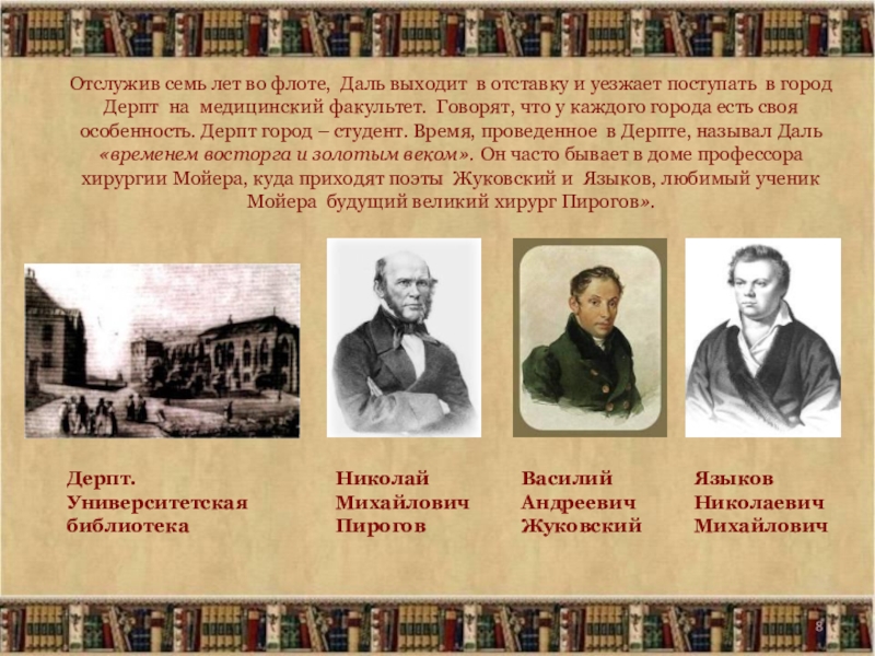 поступать в город Дерпт на медицинский факультет. Говорят, что у каждого города есть своя особенность. Дерпт город – студент. Время, проведенное в Дерпте, называл Даль «временем восторга и золотым веком». Он часто бывает в доме профессора хирургии Мойера, куда приходят поэты Жуковский и Языков, любимый ученик Мойера будущий великий хирург Пирогов».