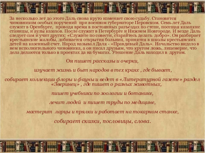 круто изменяет свою судьбу. Становится чиновником особых поручений при военном губернаторе Перовском. Семь лет Даль служит в Оренбурге, проводя время в постоянных разъездах по степи, посещая казацкие станицы, и аулы казахов. После служит в Петербурге и Нижнем Новгороде. И везде Даль следует сам и учит других: «Служите по совести, старайтесь делать добро». Он разбирает крестьянские жалобы, добивается открытия больниц, принятия в школы крестьянских детей на казенный счет. Народ называл Даля - «Правдивый Даль». Начальство видело в нем исполнительного чиновника, а он писал друзьям, что кругом ложь, лицемерие, что дела делаются только в проектах да на бумагах. Утешение Даль находил в другом.
