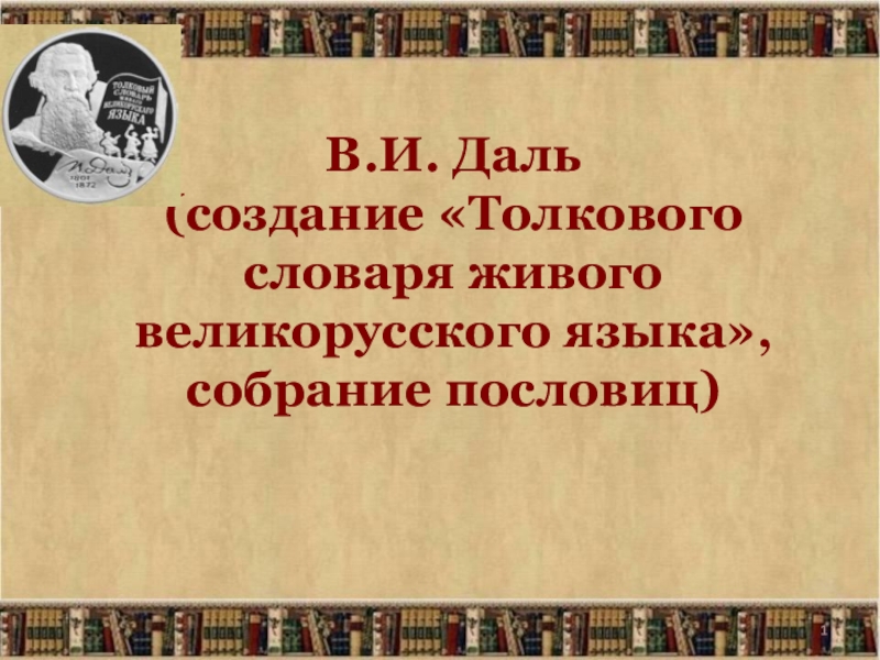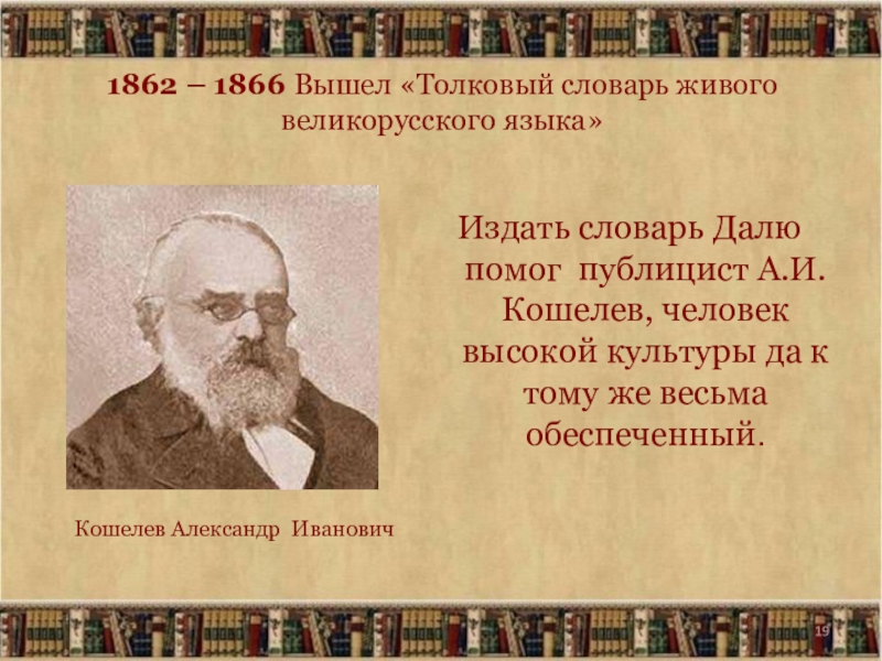Слайд 191862 – 1866 Вышел «Толковый словарь живого великорусского языка»
