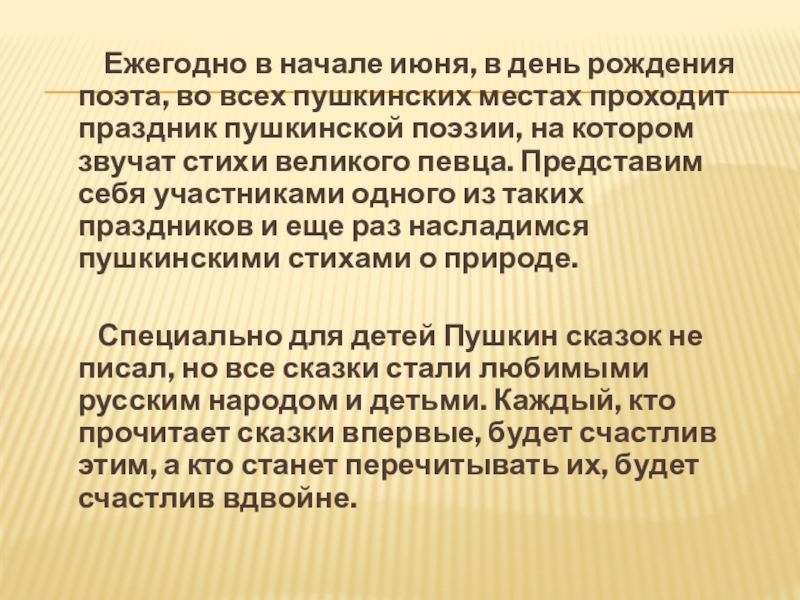 рождения поэта, во всех пушкинских местах проходит праздник пушкинской поэзии, на котором звучат стихи великого певца. Представим себя участниками одного из таких праздников и еще раз насладимся пушкинскими стихами о природе.