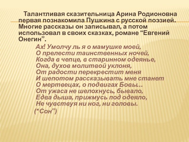 Пушкина с русской поэзией. Многие рассказы он записывал, а потом использовал в своих сказках, романе “Евгений Онегин”.
