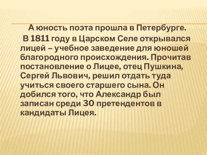 В 1811 году в Царском Селе открывался лицей – учебное заведение для юношей благородного происхождения. Прочитав постановление о Лицее, отец Пушкина, Сергей Львович, решил отдать туда учиться своего старшего сына. Он добился того, что Александр был записан среди 30 претендентов в кандидаты Лицея.