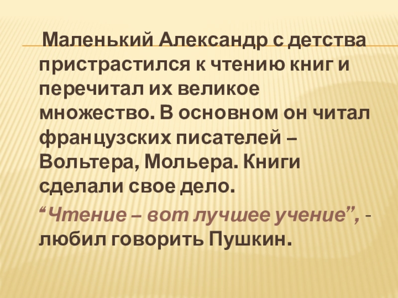 Слайд 4 Маленький Александр с детства пристрастился к чтению книг и
