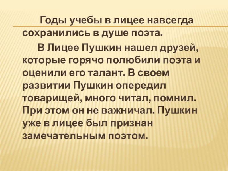 В Лицее Пушкин нашел друзей, которые горячо полюбили поэта и оценили его талант. В своем развитии Пушкин опередил товарищей, много читал, помнил. При этом он не важничал. Пушкин уже в лицее был признан замечательным поэтом.