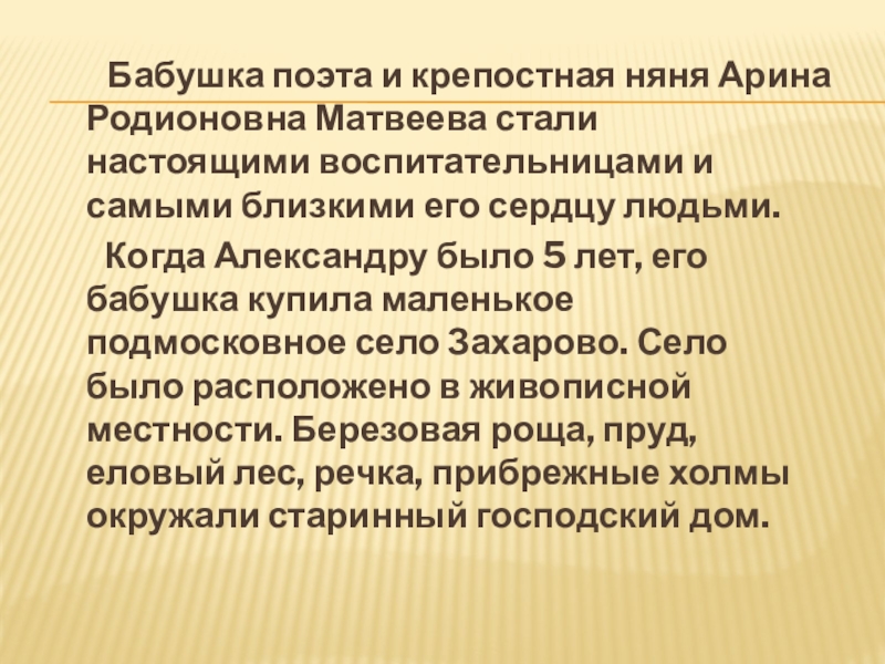 Когда Александру было 5 лет, его бабушка купила маленькое подмосковное село Захарово. Село было расположено в живописной местности. Березовая роща, пруд, еловый лес, речка, прибрежные холмы окружали старинный господский дом.