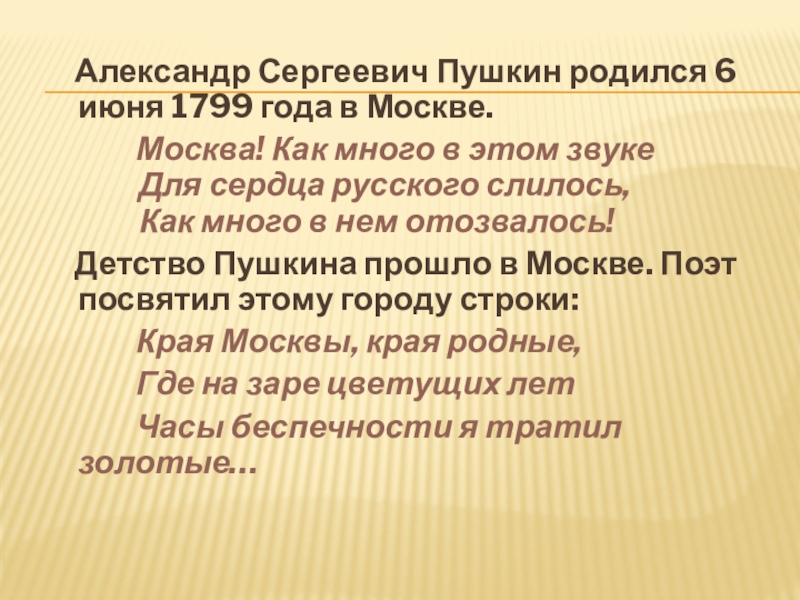 Детство Пушкина прошло в Москве. Поэт посвятил этому городу строки: