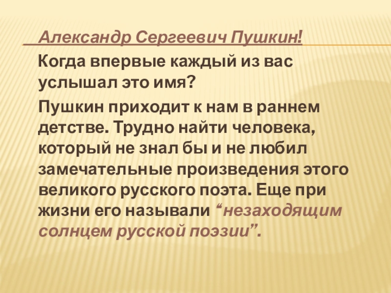 Пушкин приходит к нам в раннем детстве. Трудно найти человека, который не знал бы и не любил замечательные произведения этого великого русского поэта. Еще при жизни его называли “незаходящим солнцем русской поэзии”.