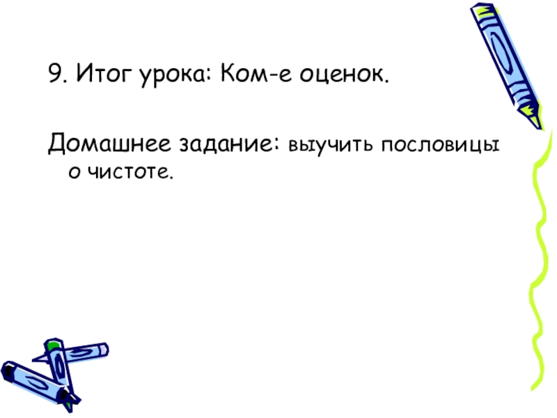 9. Итог урока: Ком-е оценок.Домашнее задание: выучить пословицы о чистоте.