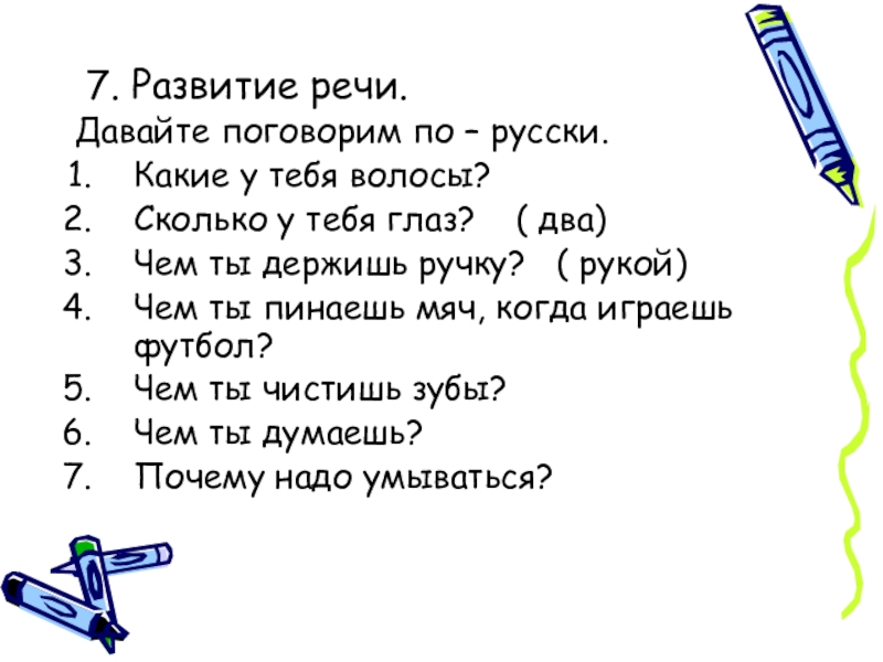 7. Развитие речи.Давайте поговорим по – русски.Какие у тебя волосы?Сколько у тебя глаз?  ( два)Чем