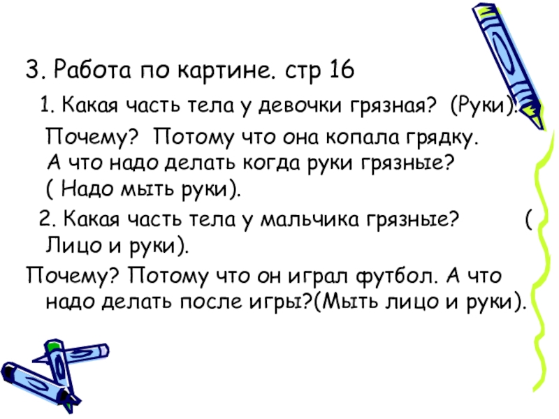 3. Работа по картине. стр 16  1. Какая часть тела у девочки грязная? (Руки).  Почему?