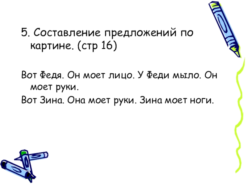 5. Составление предложений по картине. (стр 16)Вот Федя. Он моет лицо. У Феди мыло. Он моет руки.