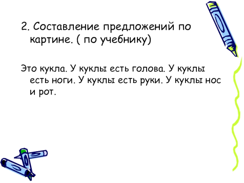 2. Составление предложений по картине. ( по учебнику)Это кукла. У куклы есть голова. У куклы есть ноги.
