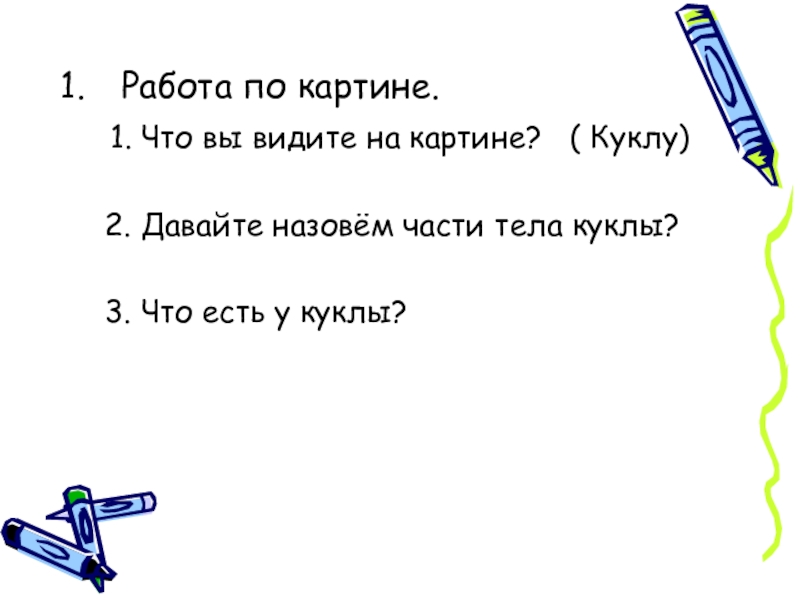 Работа по картине.   1. Что вы видите на картине?  ( Куклу)  2. Давайте