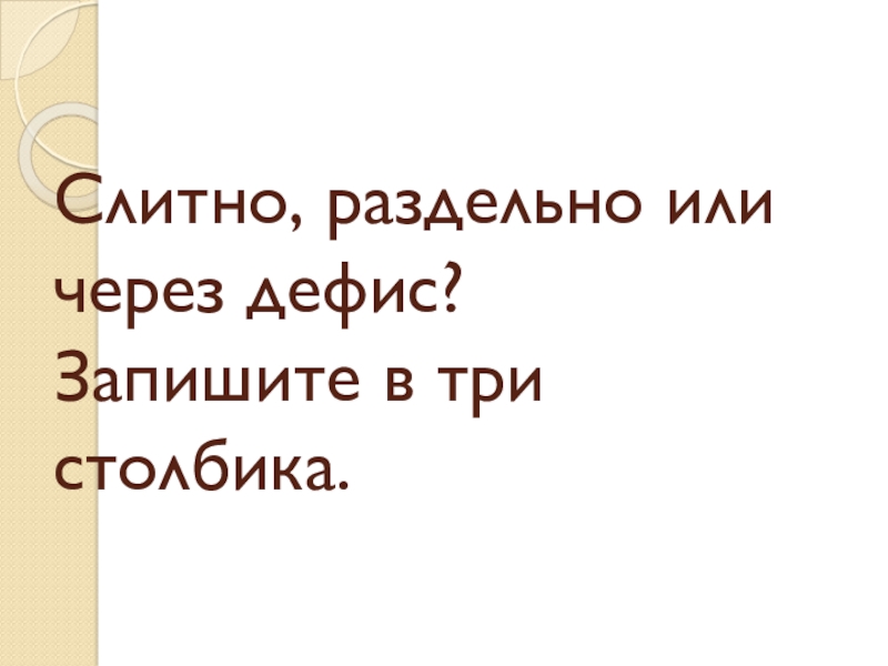 Слайд 34Слитно, раздельно или через дефис? Запишите в три столбика.