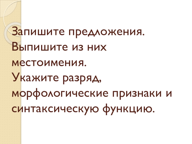 Слайд 36Запишите предложения. Выпишите из них местоимения. Укажите разряд, морфологические признаки и синтаксическую функцию.