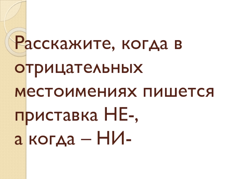 Слайд 4Расскажите, когда в отрицательных местоимениях пишется приставка НЕ-, а когда –