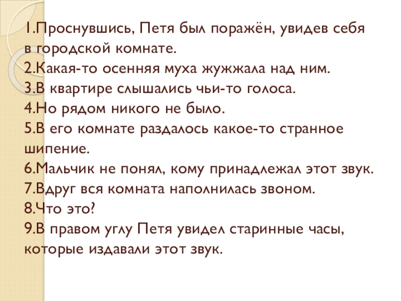 муха жужжала над ним. 3.В квартире слышались чьи-то голоса. 4.Но рядом никого не было. 5.В его комнате раздалось какое-то странное шипение. 6.Мальчик не понял, кому принадлежал этот звук. 7.Вдруг вся комната наполнилась звоном. 8.Что это? 9.В правом углу Петя увидел старинные часы, которые издавали этот звук.