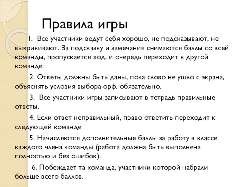 Правила игры   1. Все участники ведут себя хорошо, не подсказывают, не выкрикивают. За подсказку и