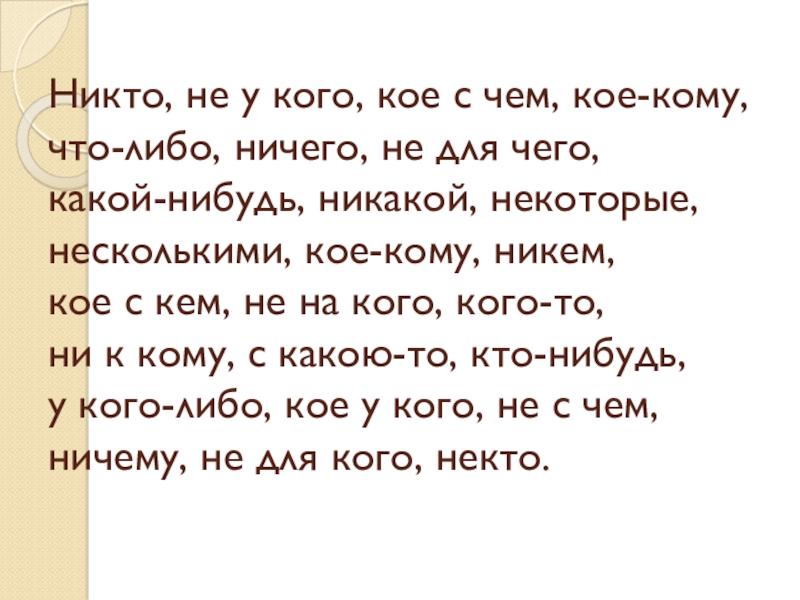 Слайд 35Никто, не у кого, кое с чем, кое-кому, что-либо, ничего, не