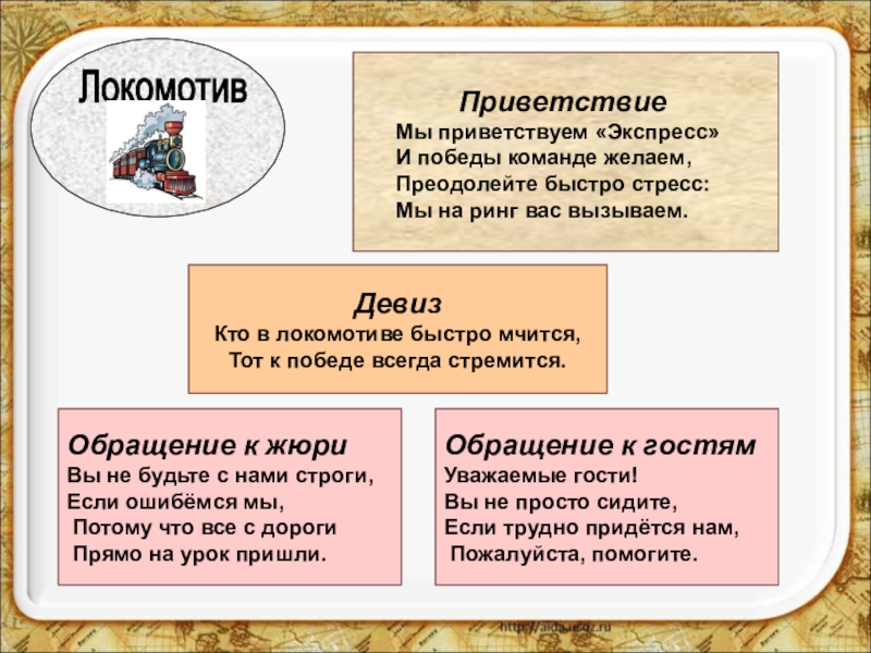 Это сайт презентаций, где можно хранить и обмениваться своими презентациями, докладами, проектами, шаблонами в формате PowerPoint с другими пользователями. Мы помогаем школьникам, студентам, учителям, преподавателям хранить и обмениваться учебными материалами.