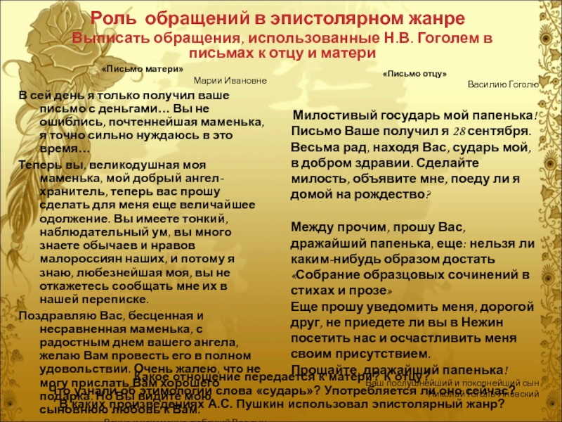 Выписать обращения, использованные Н.В. Гоголем в письмах к отцу и матери