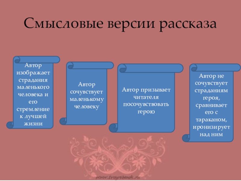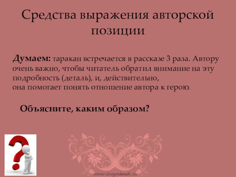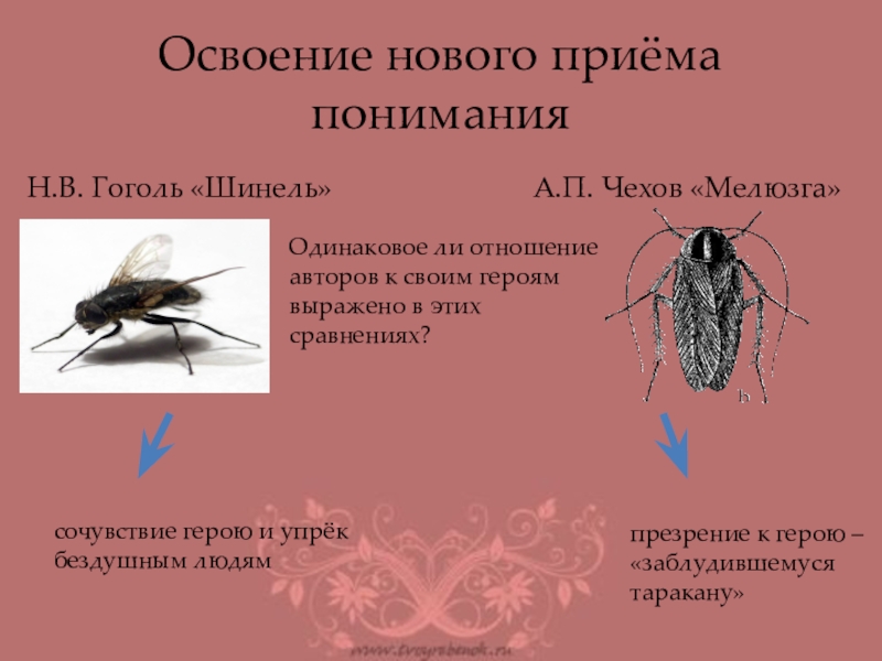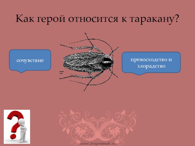 Автор не сочувствует страданиям героя, сравнивает его с тараканом, иронизирует над ним
