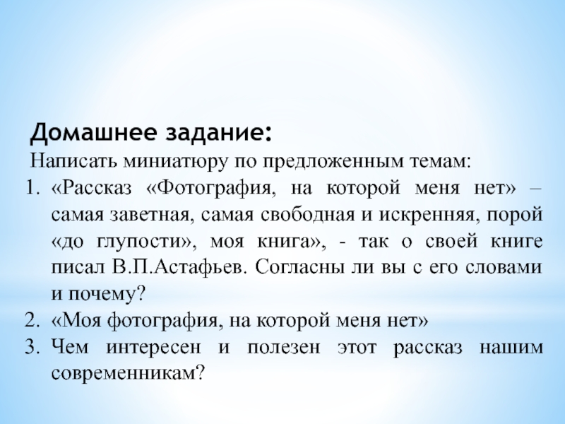 Домашнее задание:Написать миниатюру по предложенным темам:«Рассказ «Фотография, на которой меня нет» – самая заветная, самая свободная и