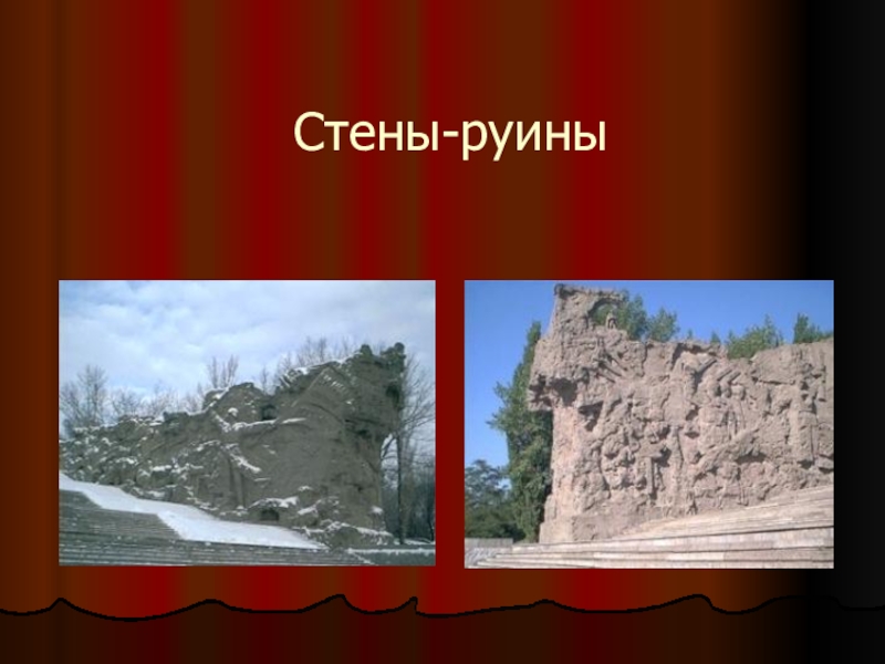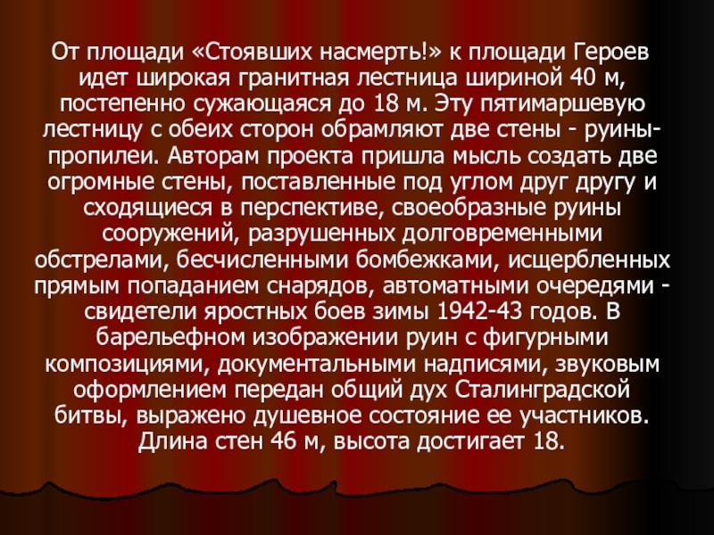 гранитная лестница шириной 40 м, постепенно сужающаяся до 18 м. Эту пятимаршевую лестницу с обеих сторон обрамляют две стены - руины-пропилеи. Авторам проекта пришла мысль создать две огромные стены, поставленные под углом друг другу и сходящиеся в перспективе, своеобразные руины сооружений, разрушенных долговременными обстрелами, бесчисленными бомбежками, исщербленных прямым попаданием снарядов, автоматными очередями - свидетели яростных боев зимы 1942-43 годов. В барельефном изображении руин с фигурными композициями, документальными надписями, звуковым оформлением передан общий дух Сталинградской битвы, выражено душевное состояние ее участников. Длина стен 46 м, высота достигает 18.