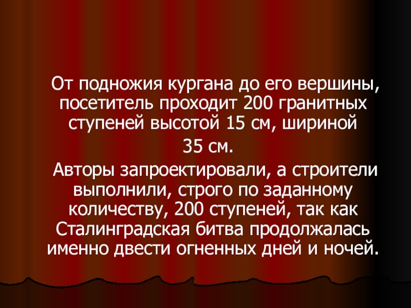 Авторы запроектировали, а строители выполнили, строго по заданному количеству, 200 ступеней, так как Сталинградская битва продолжалась именно двести огненных дней и ночей.