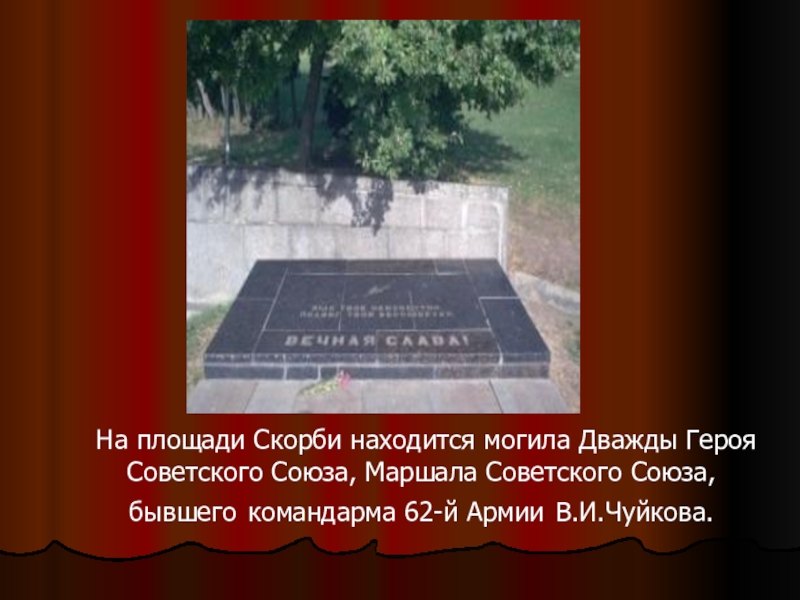 На площади Скорби находится могила Дважды Героя Советского Союза, Маршала Советского