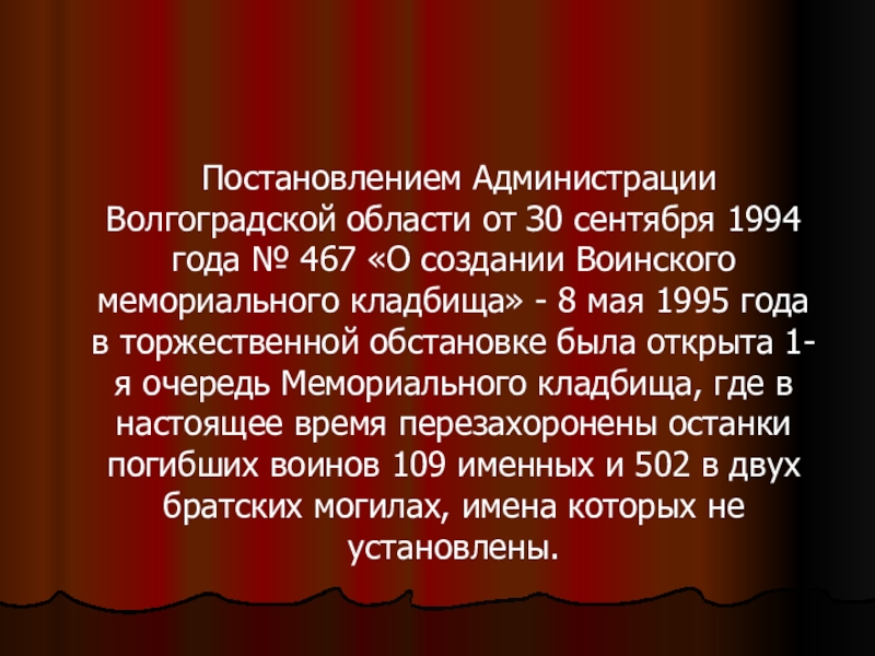 «О создании Воинского мемориального кладбища» - 8 мая 1995 года в торжественной обстановке была открыта 1-я очередь Мемориального кладбища, где в настоящее время перезахоронены останки погибших воинов 109 именных и 502 в двух братских могилах, имена которых не установлены.