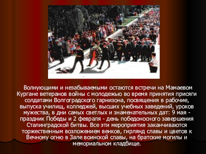 молодежью во время принятия присяги солдатами Волгоградского гарнизона, посвящения в рабочие, выпуска училищ, колледжей, высших учебных заведений, уроков мужества, в дни самых светлых и знаменательных дат: 9 мая - праздник Победы и 2 февраля - день победоносного завершения Сталинградской битвы. Все эти мероприятия заканчиваются торжественным возложением венков, гирлянд славы и цветов к Вечному огню в Зале воинской славы, на братские могилы и мемориальном кладбище.
