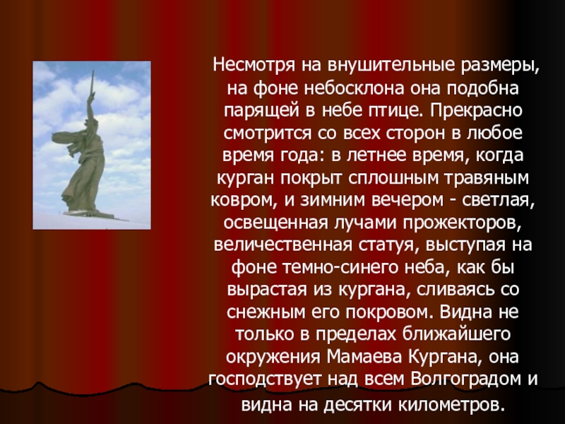 небе птице. Прекрасно смотрится со всех сторон в любое время года: в летнее время, когда курган покрыт сплошным травяным ковром, и зимним вечером - светлая, освещенная лучами прожекторов, величественная статуя, выступая на фоне темно-синего неба, как бы вырастая из кургана, сливаясь со снежным его покровом. Видна не только в пределах ближайшего окружения Мамаева Кургана, она господствует над всем Волгоградом и видна на десятки километров.
