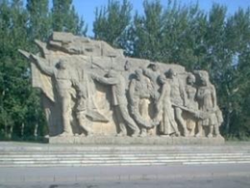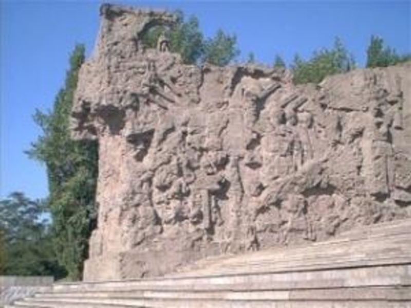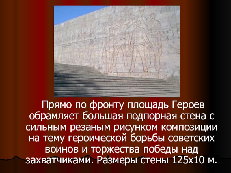 резаным рисунком композиции на тему героической борьбы советских воинов и торжества победы над захватчиками. Размеры стены 125х10 м.