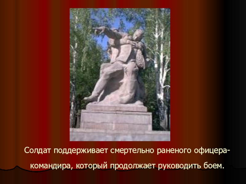 Слайд 26Солдат поддерживает смертельно раненого офицера-командира, который продолжает руководить боем.