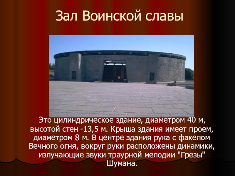 высотой стен -13,5 м. Крыша здания имеет проем, диаметром 8 м. В центре здания рука с факелом Вечного огня, вокруг руки расположены динамики, излучающие звуки траурной мелодии "Грезы" Шумана.