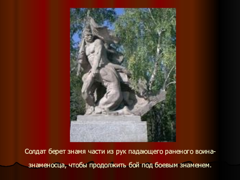 Слайд 27Солдат берет знамя части из рук падающего раненого воина-знаменосца, чтобы продолжить